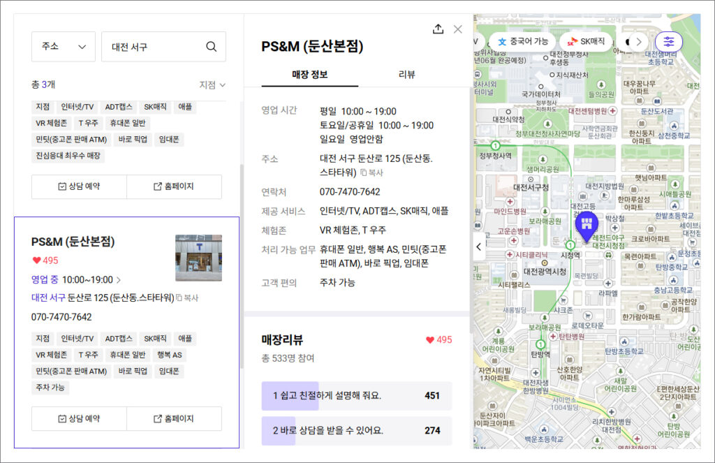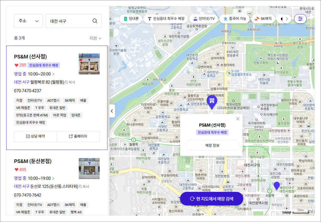 검색 결과를 보니 가까운 곳이 여러 군데 나왔는데 PS&M (선사점)이 맨 위에 나왔지만 필자는 PS&M (둔산본점)이 예전에 방문했던 기억이 나서 자세히 알아보게 되었습니다.