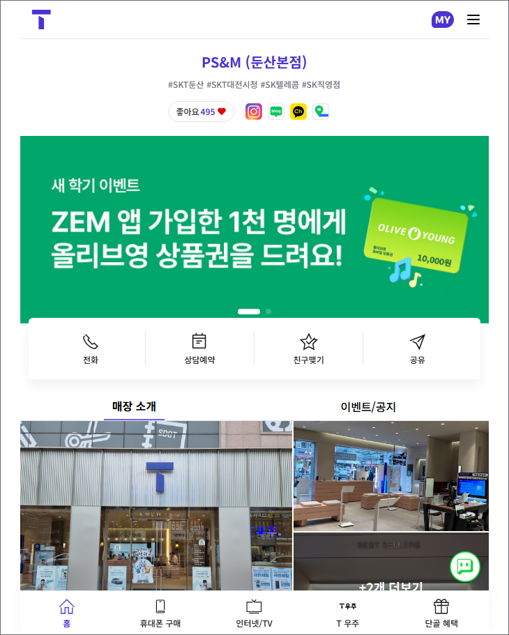 홈페이지 버튼을 클릭하면 sk 직영점 홈화면이 나오는데 전화, 상담예약, 매장 소개, 이벤트/공지도 볼 수 있었습니다.